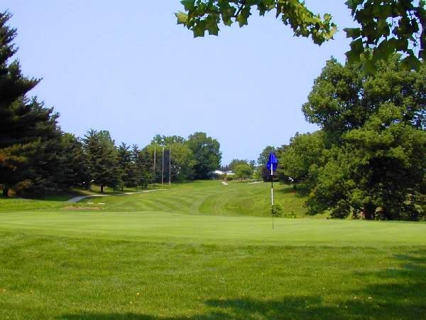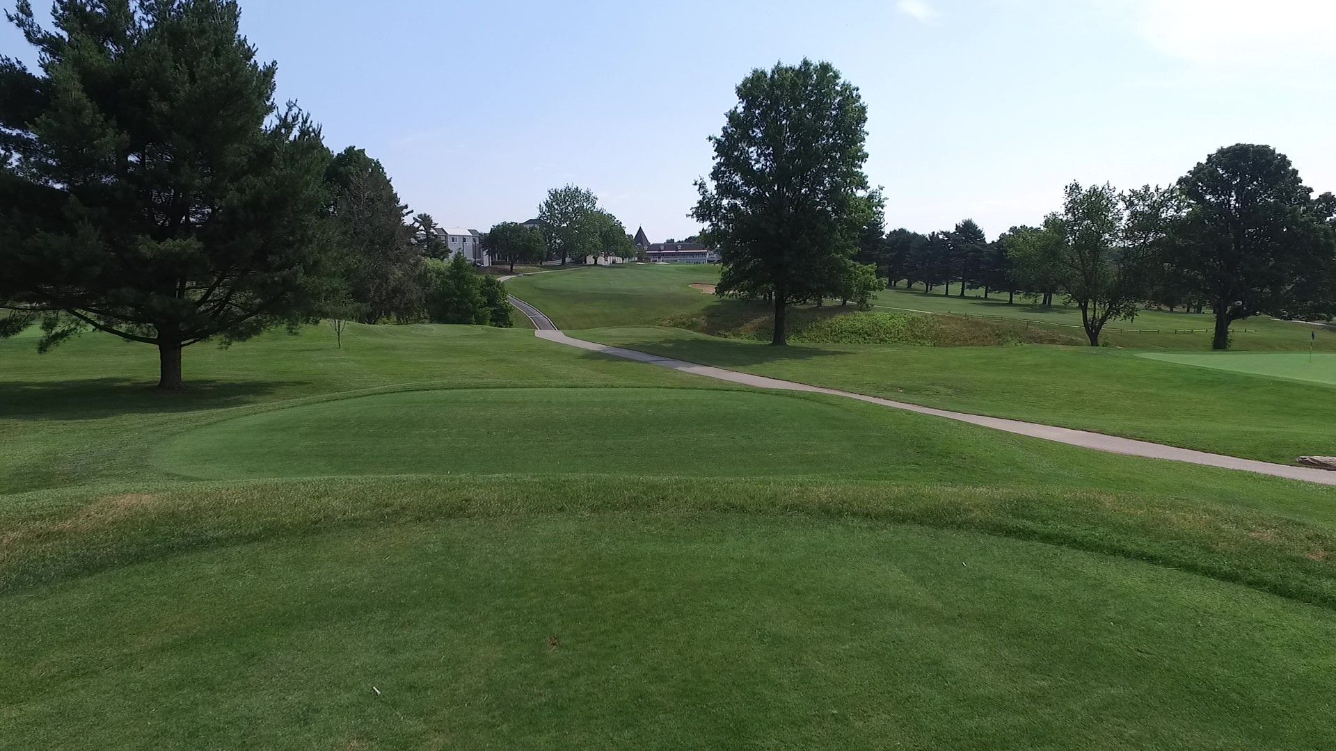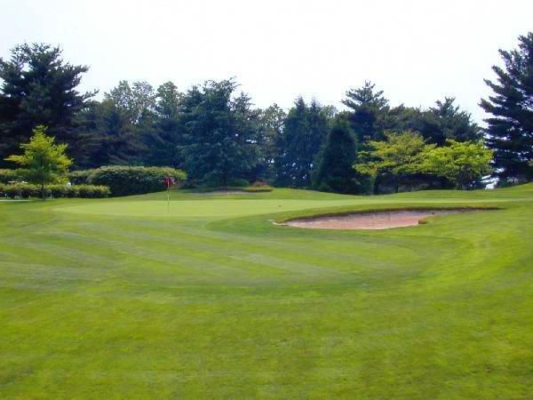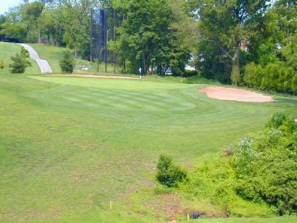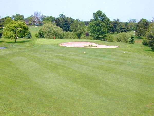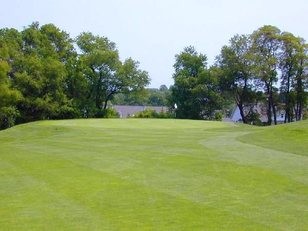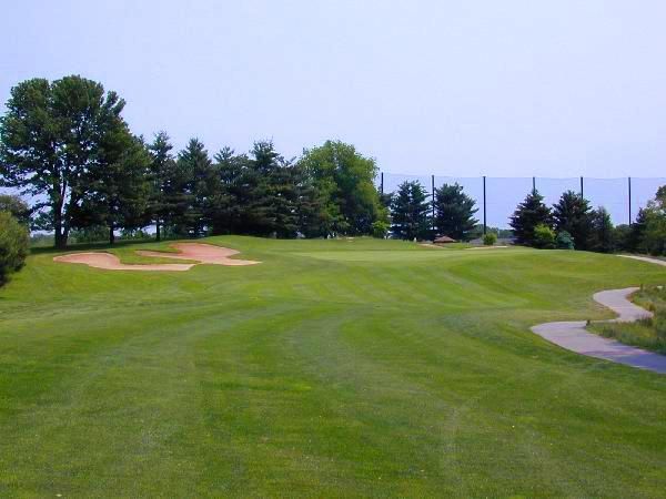 There is a blind bunker on the right side at the top of the hill. The left side of this firm green is severely sloped and the right side is shallow. This makes it difficult to get close to the hole.